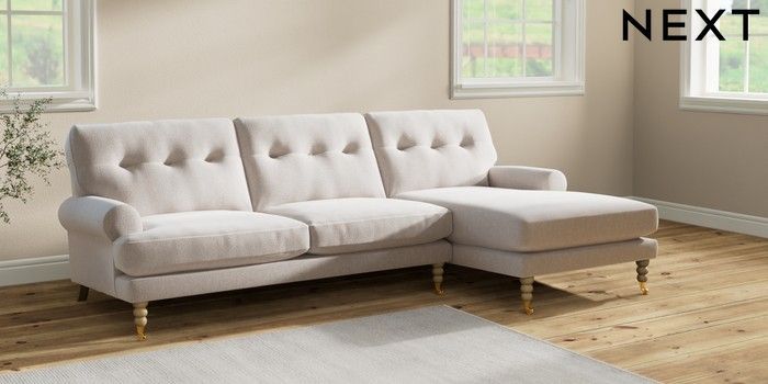 7.2.10 Erin Buttoned Back Deep Relaxed Sit Medium Sofa Chaise - Right Hand Cotswold Chenille Oyster High Classic Turned Brass Castor - Light | Made Click here to use our website with more accessibility support, for example screen readers