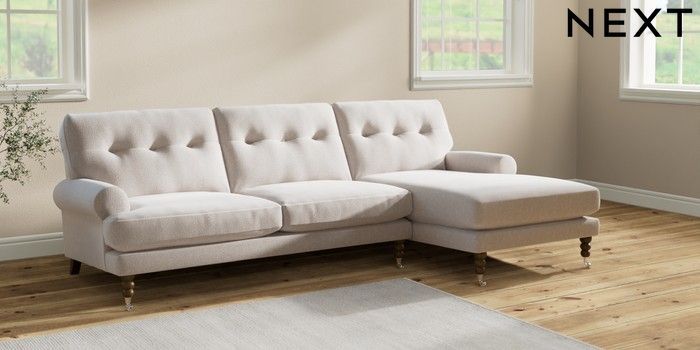 7.2.10 Erin Buttoned Back Deep Relaxed Sit Medium Sofa Chaise - Right Hand Cotswold Chenille Oyster High Classic Turned Chrome Castor - Mid | Made Click here to use our website with more accessibility support, for example screen readers