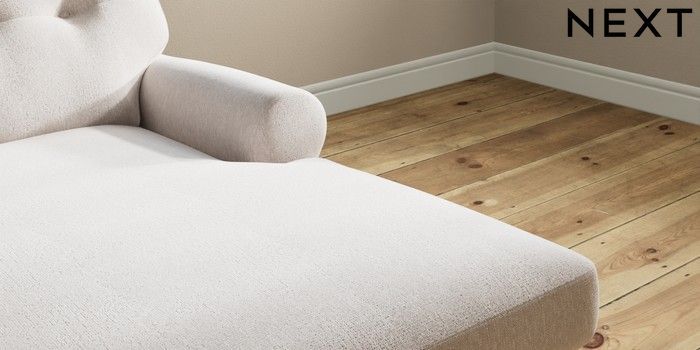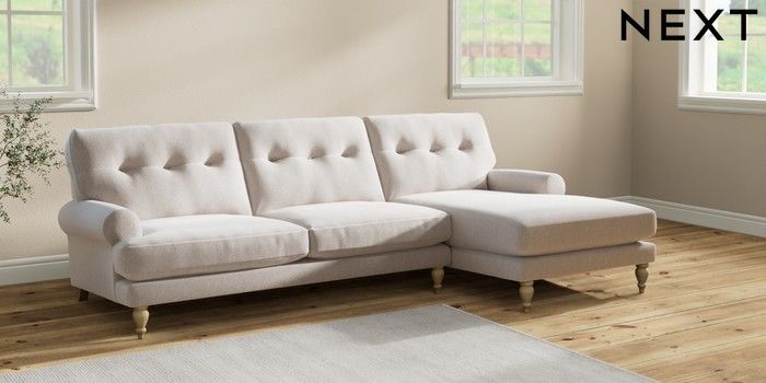 7.2.10 Erin Buttoned Back Deep Relaxed Sit Medium Sofa Chaise - Right Hand Cotswold Chenille Oyster High Classic Turned - Light | Made Click here to use our website with more accessibility support, for example screen readers