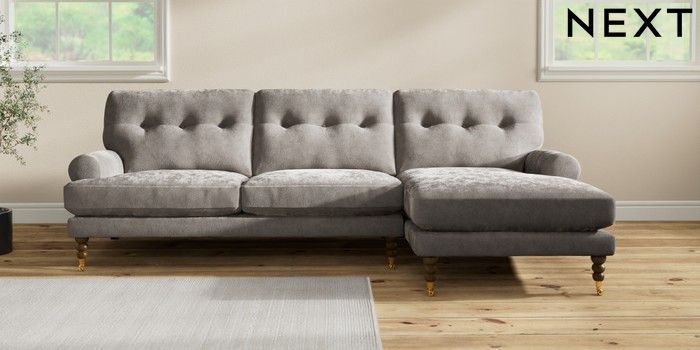 7.2.10 Erin Buttoned Back Deep Relaxed Sit Medium Sofa Chaise - Right Hand Distressed Velour French Grey High Classic Turned Brass Castor - Mid | Made Click here to use our website with more accessibility support, for example screen readers