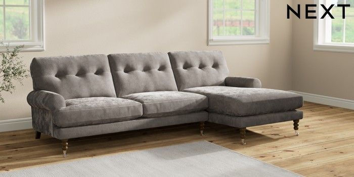 7.2.10 Erin Buttoned Back Deep Relaxed Sit Medium Sofa Chaise - Right Hand Distressed Velour French Grey High Classic Turned Chrome Castor - Mid | Made Click here to use our website with more accessibility support, for example screen readers