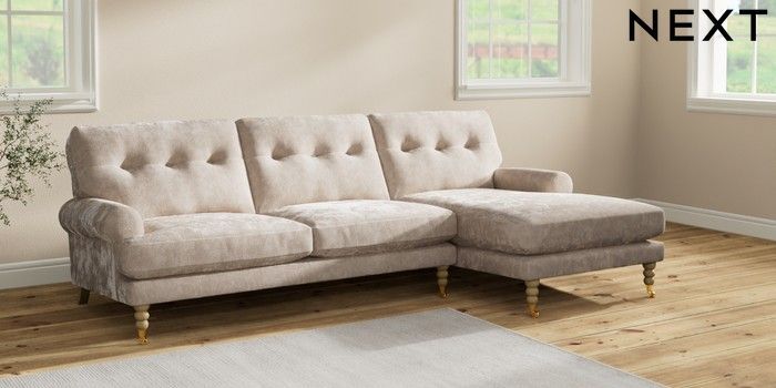 7.2.10 Erin Buttoned Back Deep Relaxed Sit Medium Sofa Chaise - Right Hand Distressed Velour Mid Natural High Classic Turned Brass Castor - Light | Made Click here to use our website with more accessibility support, for example screen readers