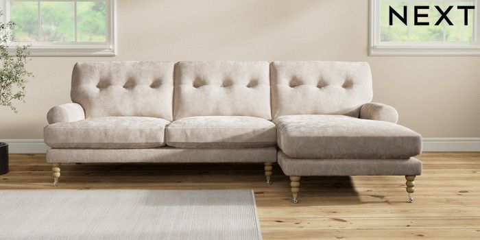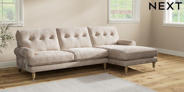 7.2.10 Erin Buttoned Back Deep Relaxed Sit Medium Sofa Chaise - Right Hand Distressed Velour Mid Natural High Classic Turned Chrome Castor - Light | Made Click here to use our website with more accessibility support, for example screen readers