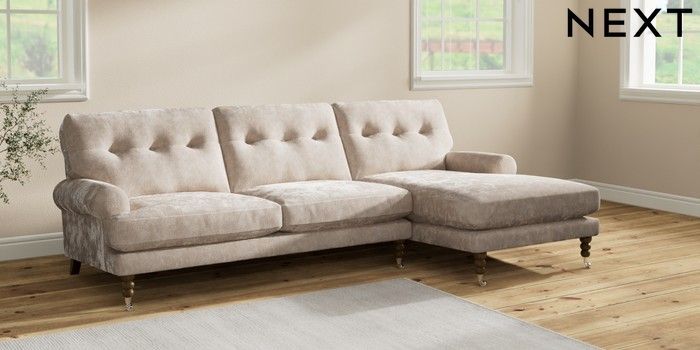 7.2.10 Erin Buttoned Back Deep Relaxed Sit Medium Sofa Chaise - Right Hand Distressed Velour Mid Natural High Classic Turned Chrome Castor - Mid | Made Click here to use our website with more accessibility support, for example screen readers