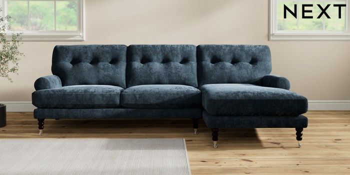 7.2.10 Erin Buttoned Back Deep Relaxed Sit Medium Sofa Chaise - Right Hand Distressed Velour Midnight Blue High Classic Turned Chrome Castor - Dark | Made Click here to use our website with more accessibility support, for example screen readers