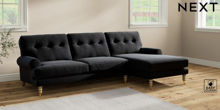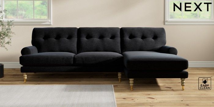 7.2.10 Erin Buttoned Back Deep Relaxed Sit Medium Sofa Chaise - Right Hand Fine Chenille Easy Clean Black High Classic Turned Brass Castor - Light | Made Click here to use our website with more accessibility support, for example screen readers