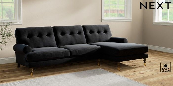 7.2.10 Erin Buttoned Back Deep Relaxed Sit Medium Sofa Chaise - Right Hand Fine Chenille Easy Clean Black High Classic Turned Brass Castor - Mid | Made Click here to use our website with more accessibility support, for example screen readers