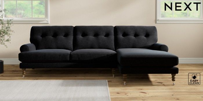 7.2.10 Erin Buttoned Back Deep Relaxed Sit Medium Sofa Chaise - Right Hand Fine Chenille Easy Clean Black High Classic Turned Chrome Castor - Mid | Made Click here to use our website with more accessibility support, for example screen readers