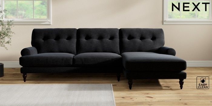 7.2.10 Erin Buttoned Back Deep Relaxed Sit Medium Sofa Chaise - Right Hand Fine Chenille Easy Clean Black High Classic Turned - Dark | Made Click here to use our website with more accessibility support, for example screen readers
