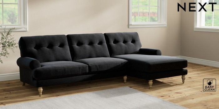 7.2.10 Erin Buttoned Back Deep Relaxed Sit Medium Sofa Chaise - Right Hand Fine Chenille Easy Clean Black High Classic Turned - Light | Made Click here to use our website with more accessibility support, for example screen readers