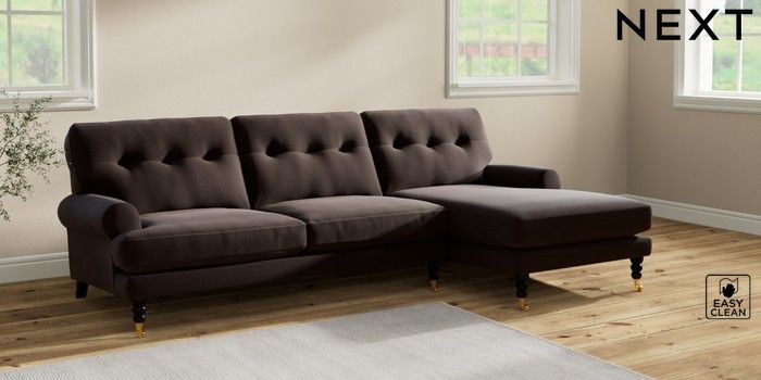 7.2.10 Erin Buttoned Back Deep Relaxed Sit Medium Sofa Chaise - Right Hand Fine Chenille Easy Clean Chocolate Brown High Classic Turned Brass Castor - Dark | Made Click here to use our website with more accessibility support, for example screen readers