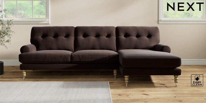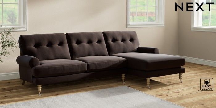 7.2.10 Erin Buttoned Back Deep Relaxed Sit Medium Sofa Chaise - Right Hand Fine Chenille Easy Clean Chocolate Brown High Classic Turned Chrome Castor - Light | Made Click here to use our website with more accessibility support, for example screen readers