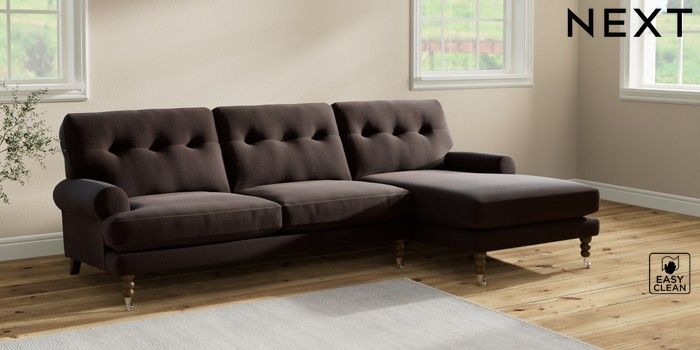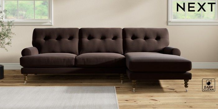 7.2.10 Erin Buttoned Back Deep Relaxed Sit Medium Sofa Chaise - Right Hand Fine Chenille Easy Clean Chocolate Brown High Classic Turned Chrome Castor - Mid | Made Click here to use our website with more accessibility support, for example screen readers