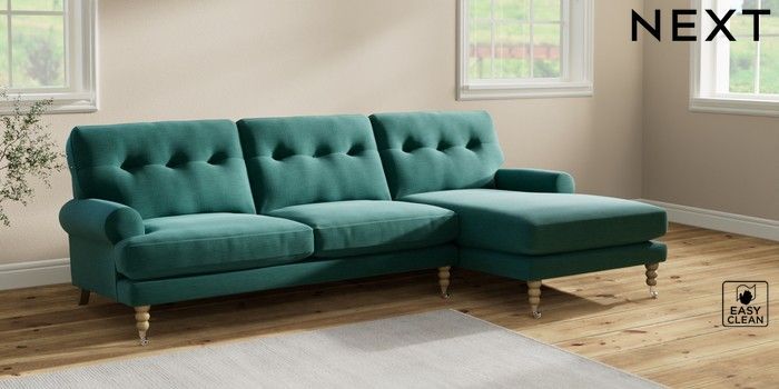 7.2.10 Erin Buttoned Back Deep Relaxed Sit Medium Sofa Chaise - Right Hand Fine Chenille Easy Clean Dark Juniper Green High Classic Turned Chrome Castor - Light | Made Click here to use our website with more accessibility support, for example screen readers