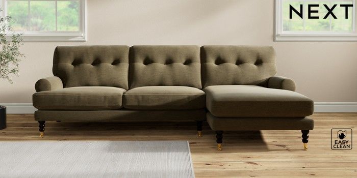 7.2.10 Erin Buttoned Back Deep Relaxed Sit Medium Sofa Chaise - Right Hand Fine Chenille Easy Clean Dark Moss Green High Classic Turned Brass Castor - Dark | Made Click here to use our website with more accessibility support, for example screen readers