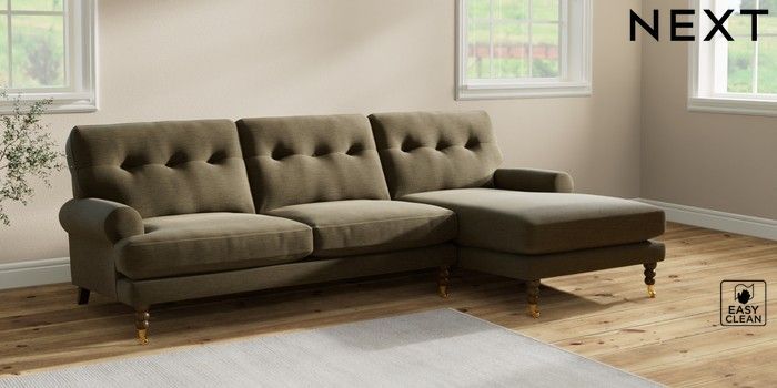 7.2.10 Erin Buttoned Back Deep Relaxed Sit Medium Sofa Chaise - Right Hand Fine Chenille Easy Clean Dark Moss Green High Classic Turned Brass Castor - Mid | Made Click here to use our website with more accessibility support, for example screen readers