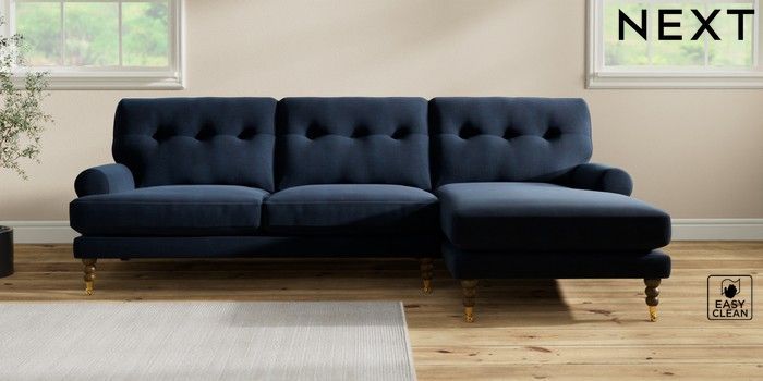 7.2.10 Erin Buttoned Back Deep Relaxed Sit Medium Sofa Chaise - Right Hand Fine Chenille Easy Clean Dark Navy Blue High Classic Turned Brass Castor - Mid | Made Click here to use our website with more accessibility support, for example screen readers