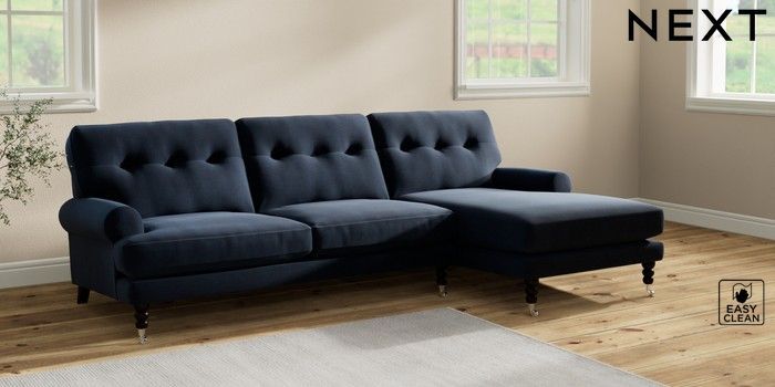 7.2.10 Erin Buttoned Back Deep Relaxed Sit Medium Sofa Chaise - Right Hand Fine Chenille Easy Clean Dark Navy Blue High Classic Turned Chrome Castor - Dark | Made Click here to use our website with more accessibility support, for example screen readers