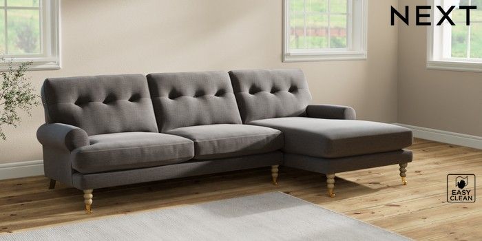 7.2.10 Erin Buttoned Back Deep Relaxed Sit Medium Sofa Chaise - Right Hand Fine Chenille Easy Clean Dark Smoke Grey High Classic Turned Brass Castor - Light | Made Click here to use our website with more accessibility support, for example screen readers