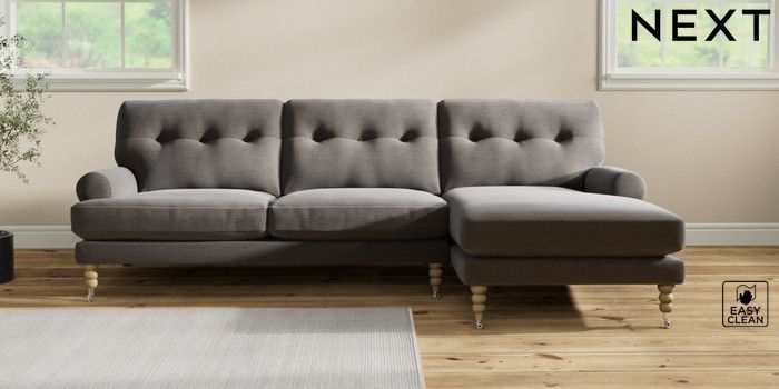 7.2.10 Erin Buttoned Back Deep Relaxed Sit Medium Sofa Chaise - Right Hand Fine Chenille Easy Clean Dark Smoke Grey High Classic Turned Chrome Castor - Light | Made Click here to use our website with more accessibility support, for example screen readers