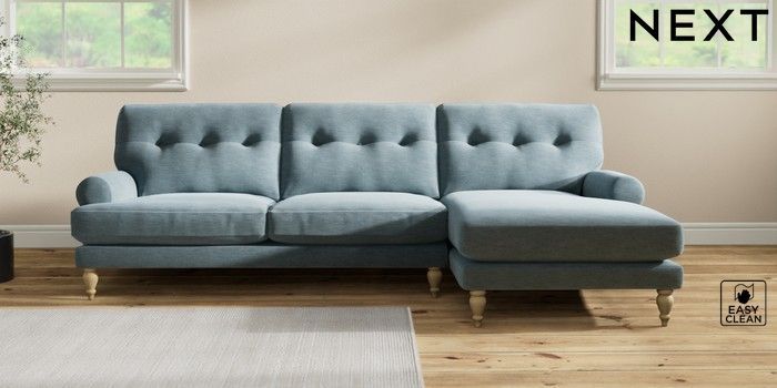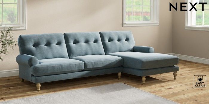 7.2.10 Erin Buttoned Back Deep Relaxed Sit Medium Sofa Chaise - Right Hand Fine Chenille Easy Clean Mid Blue High Classic Turned - Light | Made Click here to use our website with more accessibility support, for example screen readers