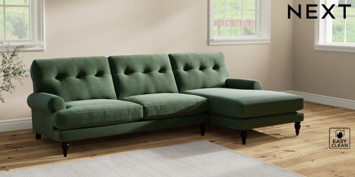 7.2.10 Erin Buttoned Back Deep Relaxed Sit Medium Sofa Chaise - Right Hand Fine Chenille Easy Clean Mid Khaki Green High Classic Turned - Dark | Made Click here to use our website with more accessibility support, for example screen readers