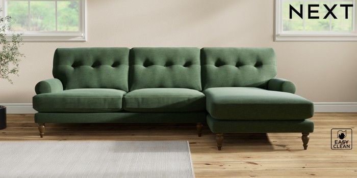 7.2.10 Erin Buttoned Back Deep Relaxed Sit Medium Sofa Chaise - Right Hand Fine Chenille Easy Clean Mid Khaki Green High Classic Turned - Mid | Made Click here to use our website with more accessibility support, for example screen readers