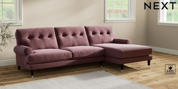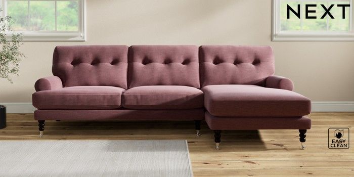 7.2.10 Erin Buttoned Back Deep Relaxed Sit Medium Sofa Chaise - Right Hand Fine Chenille Easy Clean Mid Mulberry Purple High Classic Turned Chrome Castor - Dark | Made Click here to use our website with more accessibility support, for example screen readers