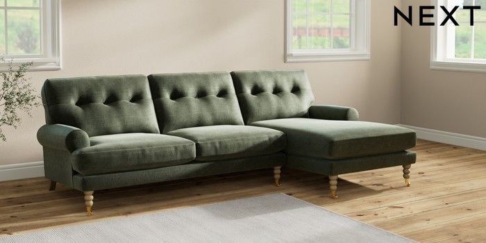 7.2.10 Erin Buttoned Back Deep Relaxed Sit Medium Sofa Chaise - Right Hand Luxe Chenille Mid Green High Classic Turned Brass Castor - Light | Made Click here to use our website with more accessibility support, for example screen readers