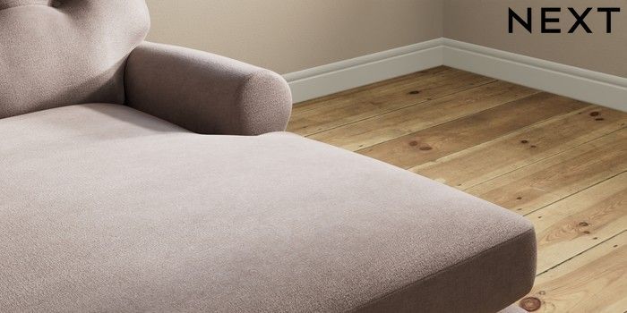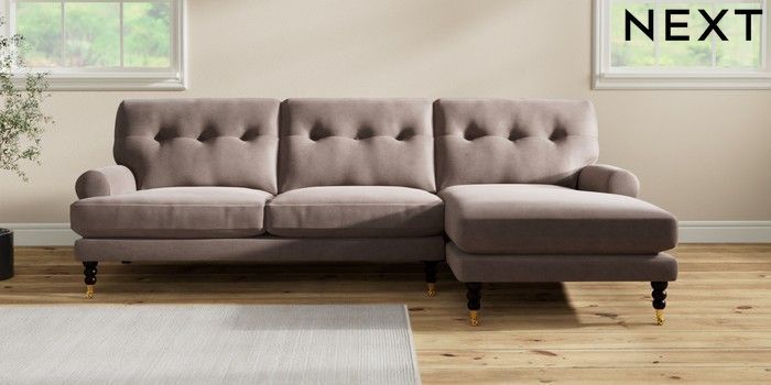 7.2.10 Erin Buttoned Back Deep Relaxed Sit Medium Sofa Chaise - Right Hand Luxe Chenille Mink Brown High Classic Turned Brass Castor - Dark | Made Click here to use our website with more accessibility support, for example screen readers