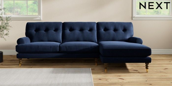 7.2.10 Erin Buttoned Back Deep Relaxed Sit Medium Sofa Chaise - Right Hand Luxe Chenille Navy Blue High Classic Turned Brass Castor - Mid | Made Click here to use our website with more accessibility support, for example screen readers