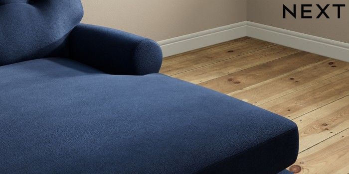 7.2.10 Erin Buttoned Back Deep Relaxed Sit Medium Sofa Chaise - Right Hand Luxe Chenille Navy Blue High Classic Turned Chrome Castor - Mid | Made Click here to use our website with more accessibility support, for example screen readers