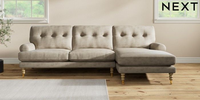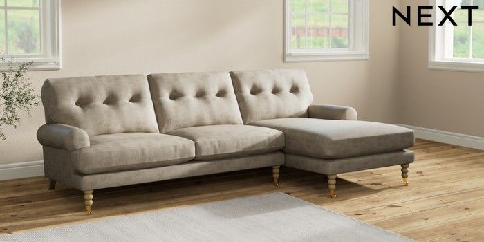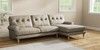7.2.10 Erin Buttoned Back Deep Relaxed Sit Medium Sofa Chaise - Right Hand Monza Faux Leather Easy Clean Mink Brown High Classic Turned Brass Castor - Light | Made Click here to use our website with more accessibility support, for example screen readers