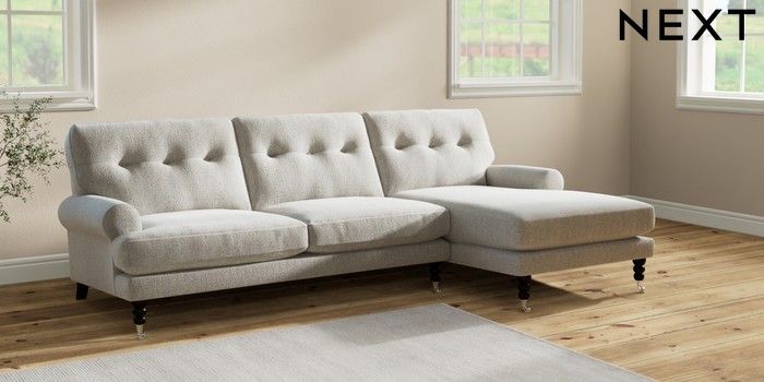 7.2.10 Erin Buttoned Back Deep Relaxed Sit Medium Sofa Chaise - Right Hand Multi Weave Light Blue High Classic Turned Chrome Castor - Dark | Made Click here to use our website with more accessibility support, for example screen readers