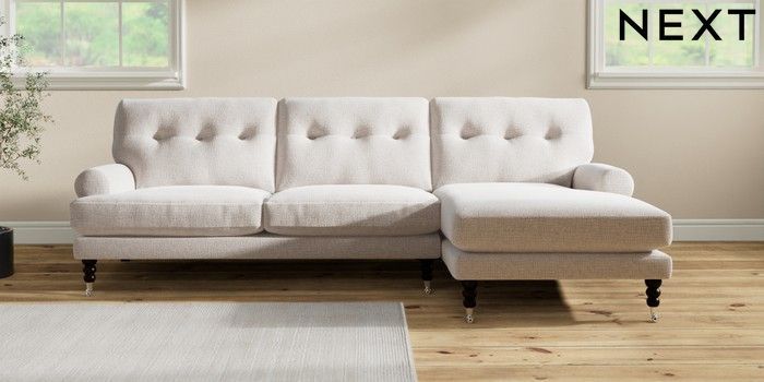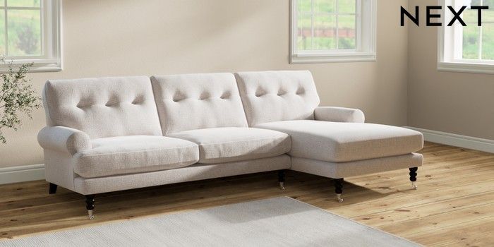 7.2.10 Erin Buttoned Back Deep Relaxed Sit Medium Sofa Chaise - Right Hand Multi Weave Oyster High Classic Turned Chrome Castor - Dark | Made Click here to use our website with more accessibility support, for example screen readers