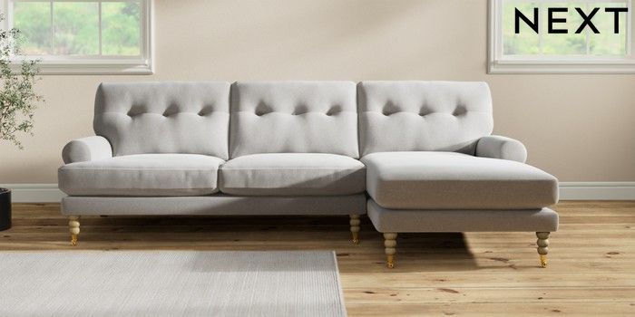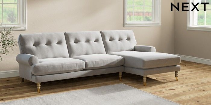 7.2.10 Erin Buttoned Back Deep Relaxed Sit Medium Sofa Chaise - Right Hand Natural Mix Light Grey High Classic Turned Brass Castor - Light | Made Click here to use our website with more accessibility support, for example screen readers