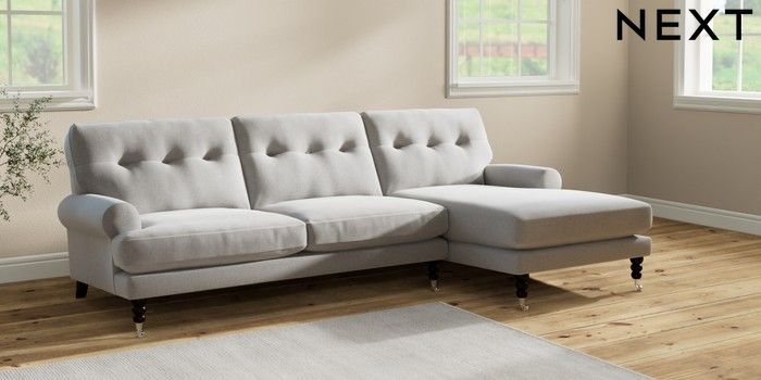 7.2.10 Erin Buttoned Back Deep Relaxed Sit Medium Sofa Chaise - Right Hand Natural Mix Light Grey High Classic Turned Chrome Castor - Dark | Made Click here to use our website with more accessibility support, for example screen readers