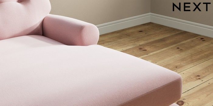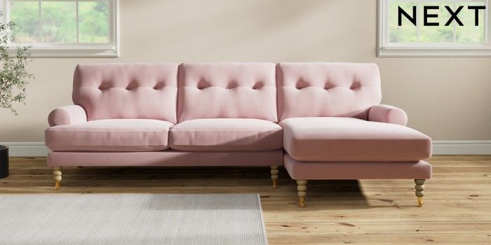 7.2.10 Erin Buttoned Back Deep Relaxed Sit Medium Sofa Chaise - Right Hand Natural Mix Light Rose Pink High Classic Turned Brass Castor - Light | Made Click here to use our website with more accessibility support, for example screen readers