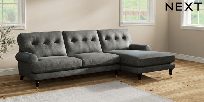 7.2.10 Erin Buttoned Back Deep Relaxed Sit Medium Sofa Chaise - Right Hand Plush Chenille Dark Grey High Classic Turned Brass Castor - Dark | Made Click here to use our website with more accessibility support, for example screen readers