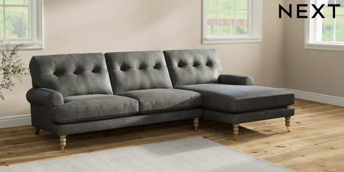 7.2.10 Erin Buttoned Back Deep Relaxed Sit Medium Sofa Chaise - Right Hand Plush Chenille Dark Grey High Classic Turned Brass Castor - Light | Made Click here to use our website with more accessibility support, for example screen readers
