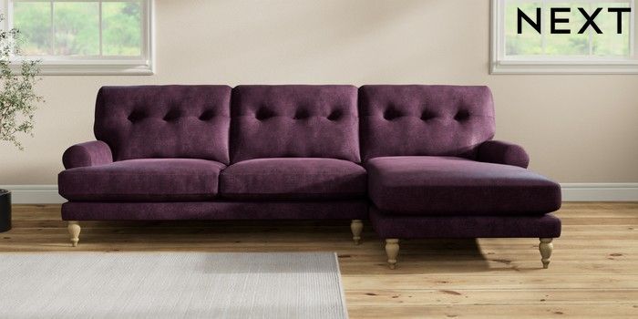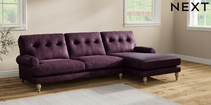 7.2.10 Erin Buttoned Back Deep Relaxed Sit Medium Sofa Chaise - Right Hand Plush Chenille Dark Plum Purple High Classic Turned - Light | Made Click here to use our website with more accessibility support, for example screen readers