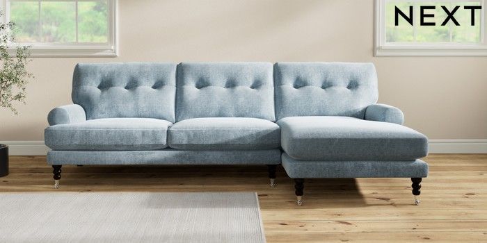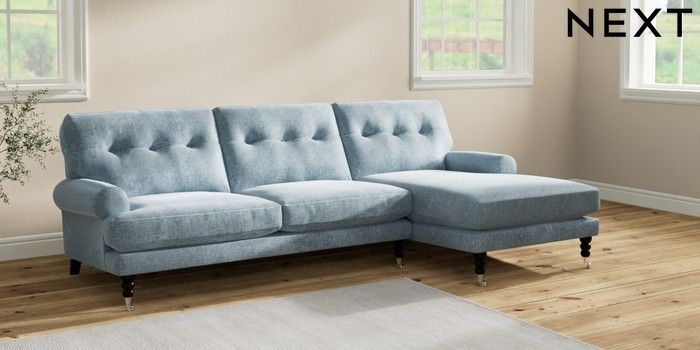 7.2.10 Erin Buttoned Back Deep Relaxed Sit Medium Sofa Chaise - Right Hand Plush Chenille Light Blue High Classic Turned Chrome Castor - Dark | Made Click here to use our website with more accessibility support, for example screen readers