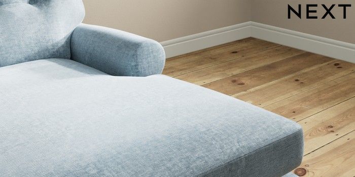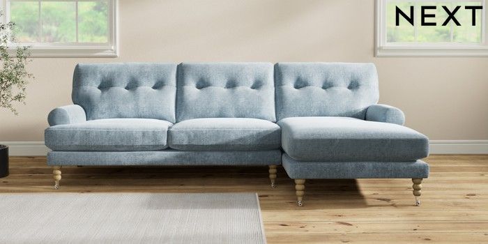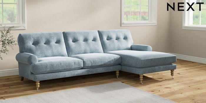 7.2.10 Erin Buttoned Back Deep Relaxed Sit Medium Sofa Chaise - Right Hand Plush Chenille Light Blue High Classic Turned Chrome Castor - Light | Made Click here to use our website with more accessibility support, for example screen readers