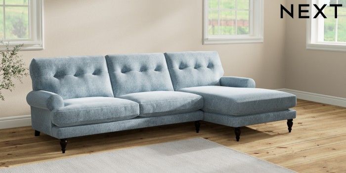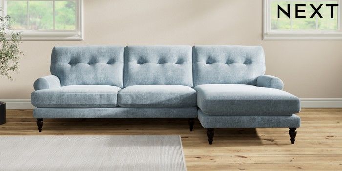 7.2.10 Erin Buttoned Back Deep Relaxed Sit Medium Sofa Chaise - Right Hand Plush Chenille Light Blue High Classic Turned - Dark | Made Click here to use our website with more accessibility support, for example screen readers