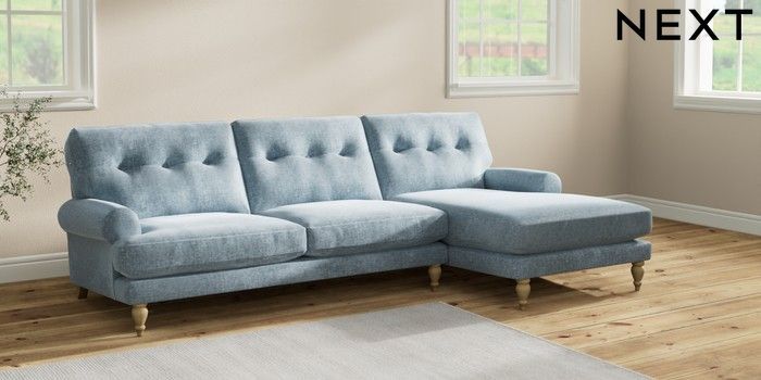 7.2.10 Erin Buttoned Back Deep Relaxed Sit Medium Sofa Chaise - Right Hand Plush Chenille Light Blue High Classic Turned - Light | Made Click here to use our website with more accessibility support, for example screen readers