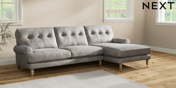 7.2.10 Erin Buttoned Back Deep Relaxed Sit Medium Sofa Chaise - Right Hand Plush Chenille Light Grey High Classic Turned Brass Castor - Light | Made Click here to use our website with more accessibility support, for example screen readers