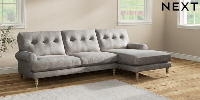 7.2.10 Erin Buttoned Back Deep Relaxed Sit Medium Sofa Chaise - Right Hand Plush Chenille Light Grey High Classic Turned Chrome Castor - Light | Made Click here to use our website with more accessibility support, for example screen readers
