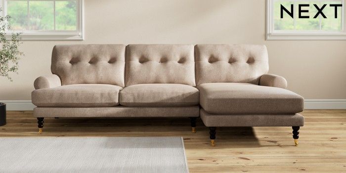 7.2.10 Erin Buttoned Back Deep Relaxed Sit Medium Sofa Chaise - Right Hand Plush Chenille Mid Natural High Classic Turned Brass Castor - Dark | Made Click here to use our website with more accessibility support, for example screen readers
