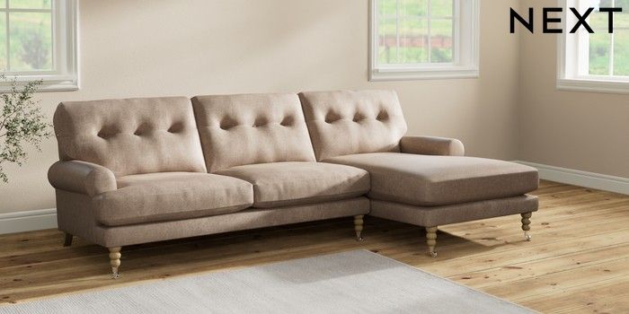 7.2.10 Erin Buttoned Back Deep Relaxed Sit Medium Sofa Chaise - Right Hand Plush Chenille Mid Natural High Classic Turned Chrome Castor - Light | Made Click here to use our website with more accessibility support, for example screen readers