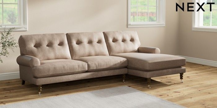 7.2.10 Erin Buttoned Back Deep Relaxed Sit Medium Sofa Chaise - Right Hand Plush Chenille Mid Natural High Classic Turned Chrome Castor - Mid | Made Click here to use our website with more accessibility support, for example screen readers